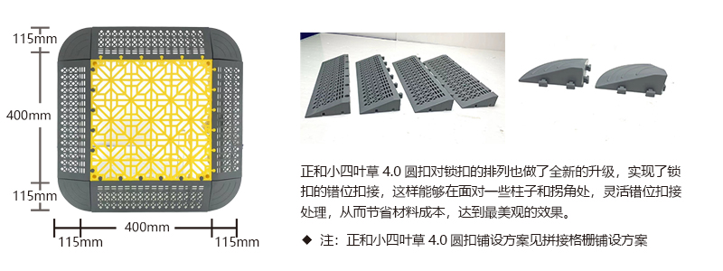 正和小四葉草4.0圓扣采用通扣設計,可以確保產品鋪設完成后在任何區域單獨取出,極大的方便了客戶后期局部清理泥沙等,給店面的日常衛生維護提供了很好的基礎。